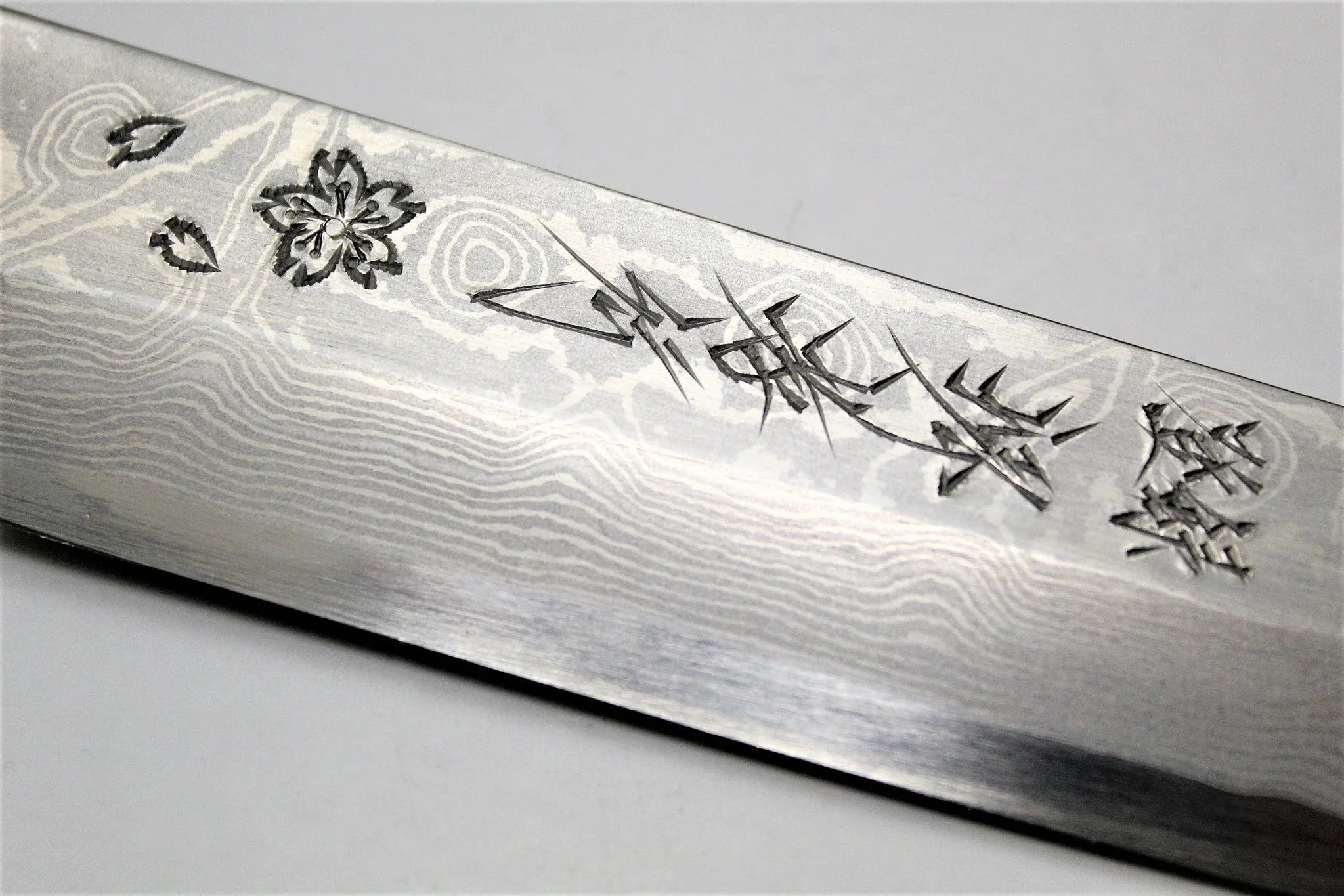 This Hien blade has a stunning Damascus pattern with hand etched Sakura blossoms which is unique to each blade. The blade material is Ginsan (Silver #3) Stainless Steel and we recommend wiping the blade down after each use. The handle is designed from Wenge and buffalo horn to finish off this stunning blade.