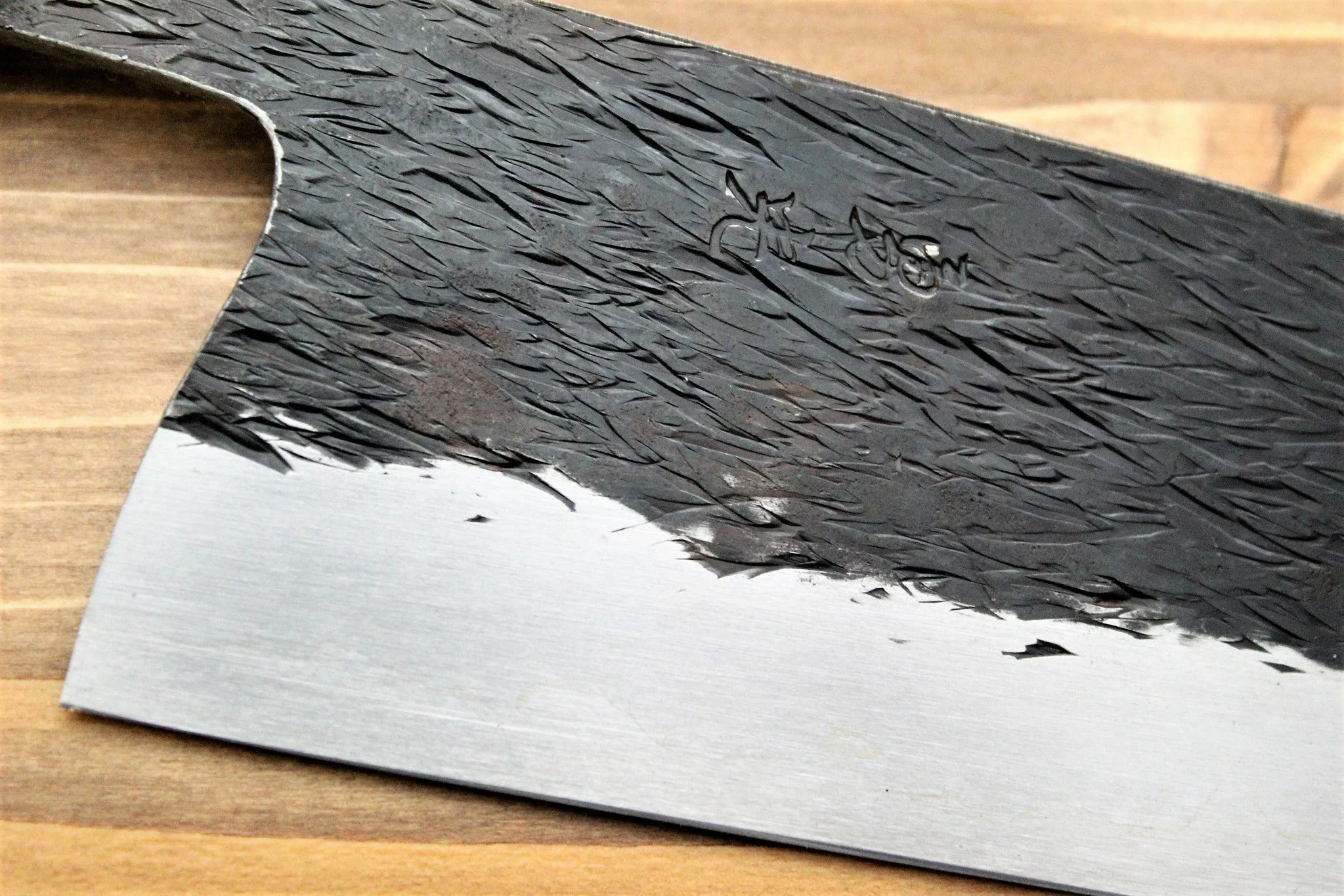 The blade has a stunning custom finish with stately atmosphere. Black finish (Kurochi) is an old-fashioned Japanese style of kitchen knife finishing method. The method does not scrape the entire surface of the blade that has been hardened by quenching, but leaves the black portion of the side other than the blade.
