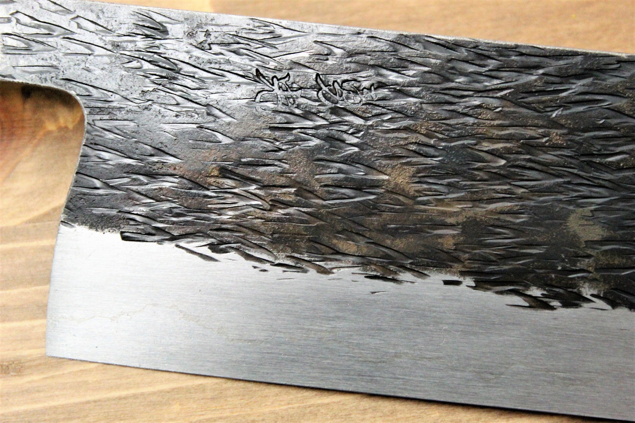 The blade has a stunning custom finish with stately atmosphere. The hammered black finish (Kurochi) is an old-fashioned Japanese style of kitchen knife finishing method. The method does not scrape the entire surface of the blade that has been hardened by quenching, but leaves the black portion of the side other than the blade.