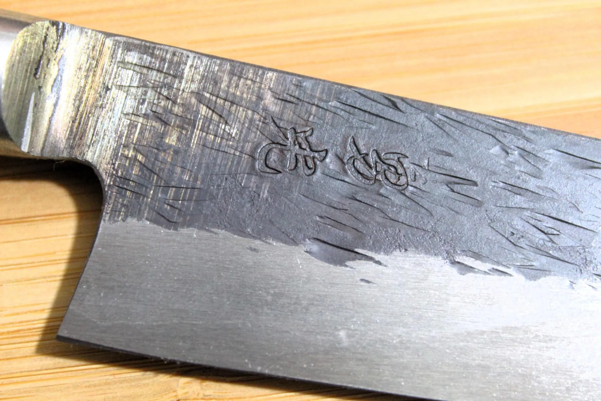 The blade has a stunning custom finish with stately atmosphere. Black finish (Kurochi) is an old-fashioned Japanese style of kitchen knife finishing method. The method does not scrape the entire surface of the blade that has been hardened by quenching, but leaves the black portion of the side other than the blade.