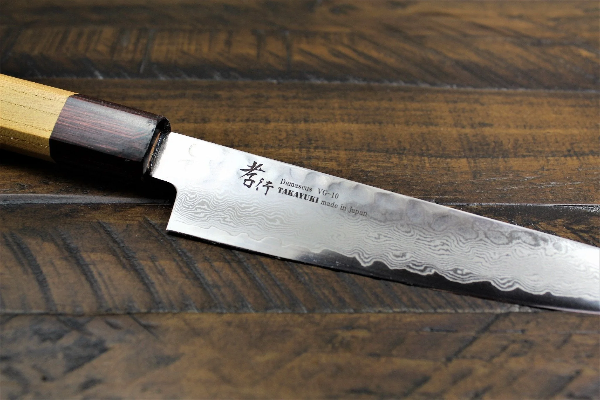 This is a Sakai Takayuki Western style series that is resistant to rust. The blade has a hammer eye pattern full and is a fascinating blade that features a beautiful ripple that can be used widely from home to professional. The handle uses Mahogany and Japanese Keyaki which is a precious tree with a beautiful hard grain of wood in Japan.