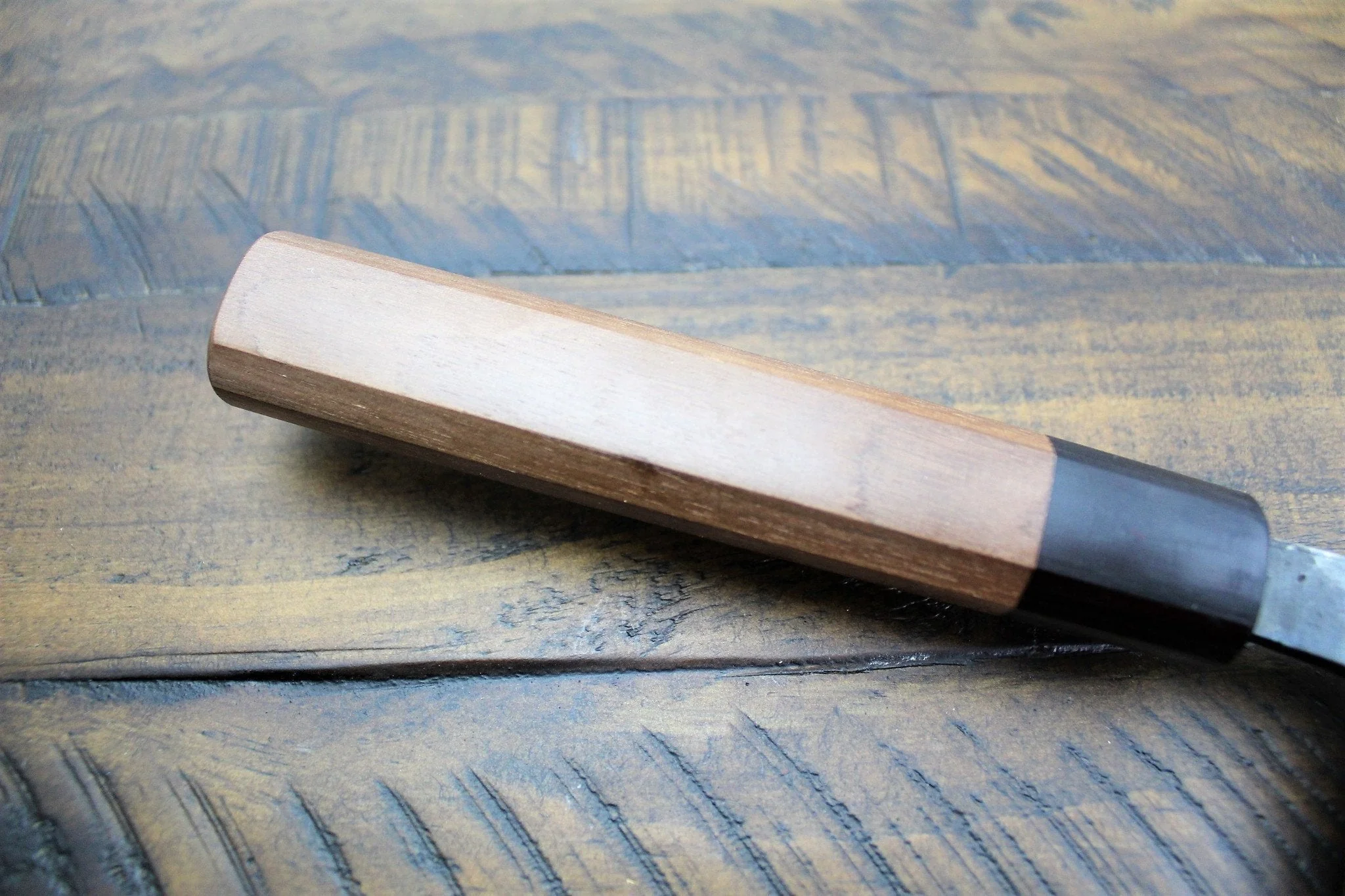 Yes. Walnut is a dense, durable hardwood that provides excellent grip even when wet. As a traditional Japanese Wa-handle, it is designed to be lightweight, shifting the balance of the knife toward the blade for more effortless cutting.